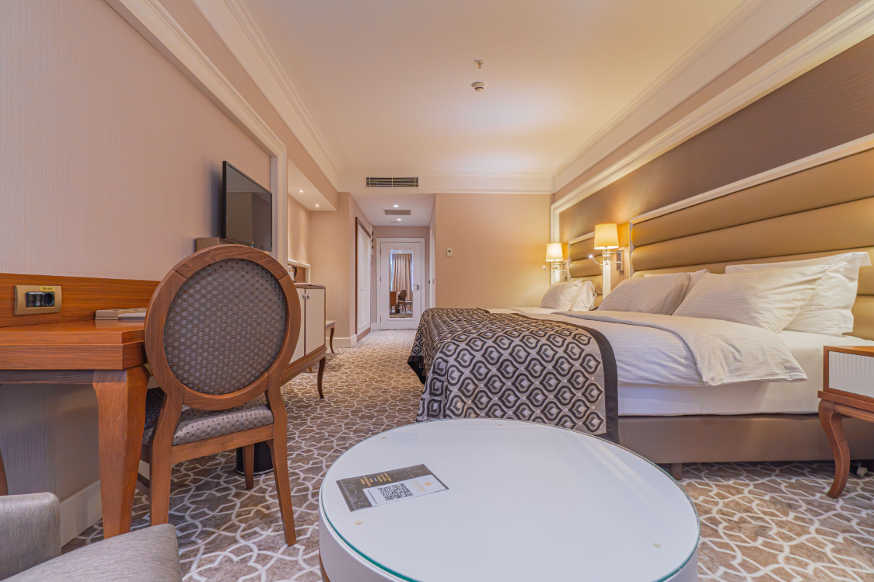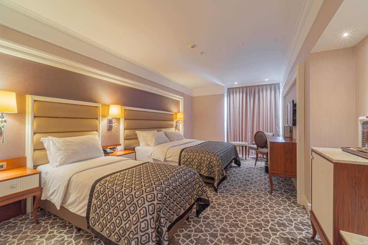 38 m2 genişliğinde olan odalarımızda 1 çift kişilik yatak 1 tane de tek kişilik yatak bulunmaktadır.